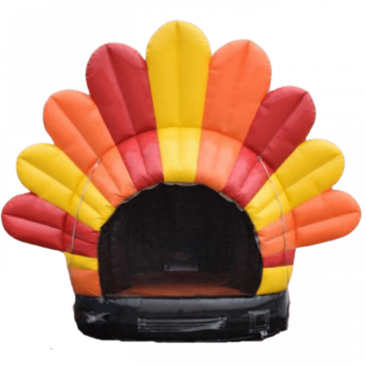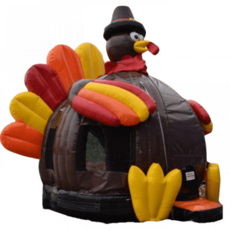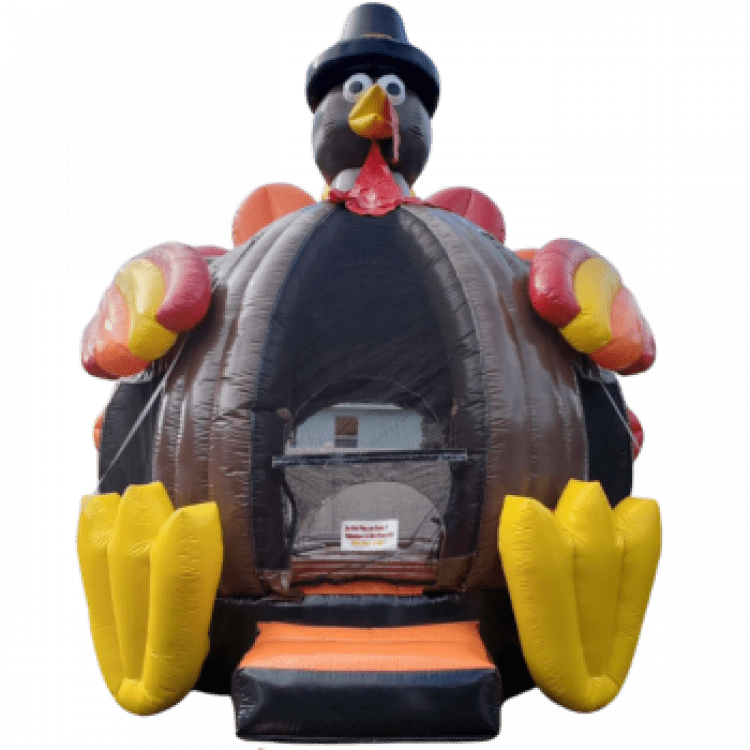 Gobble Til You Wobble and then bounce it off in this unique Turkey Bounce House. Great for any Fall Festival or family get together! Kids can Ruffle some feathers And Strut Their Stuff In this wacky Holiday themed Inflatable. (Stuffing not Included)