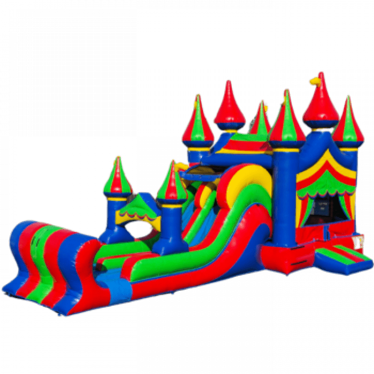 Experience The Thrill of The Big Top in The Comfort of Your Own Backyard. This Bounce house Dual Lane Slide Combo Will Provide Hours of Fun For Your Guests. The Classic Red, Yellow & Blue Color Scheme Blends Seamlessly Into Any Party Theme. Add Some Water On Those Hot Summer Days For a Whole New Level Of Fun!